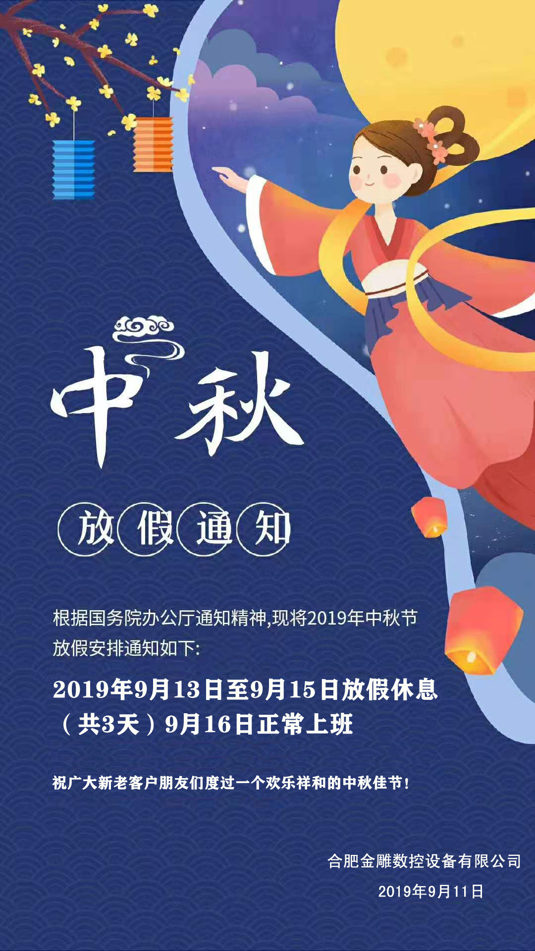 2019年合肥金雕數(shù)控設(shè)備有限公司中秋節(jié)放假通知
