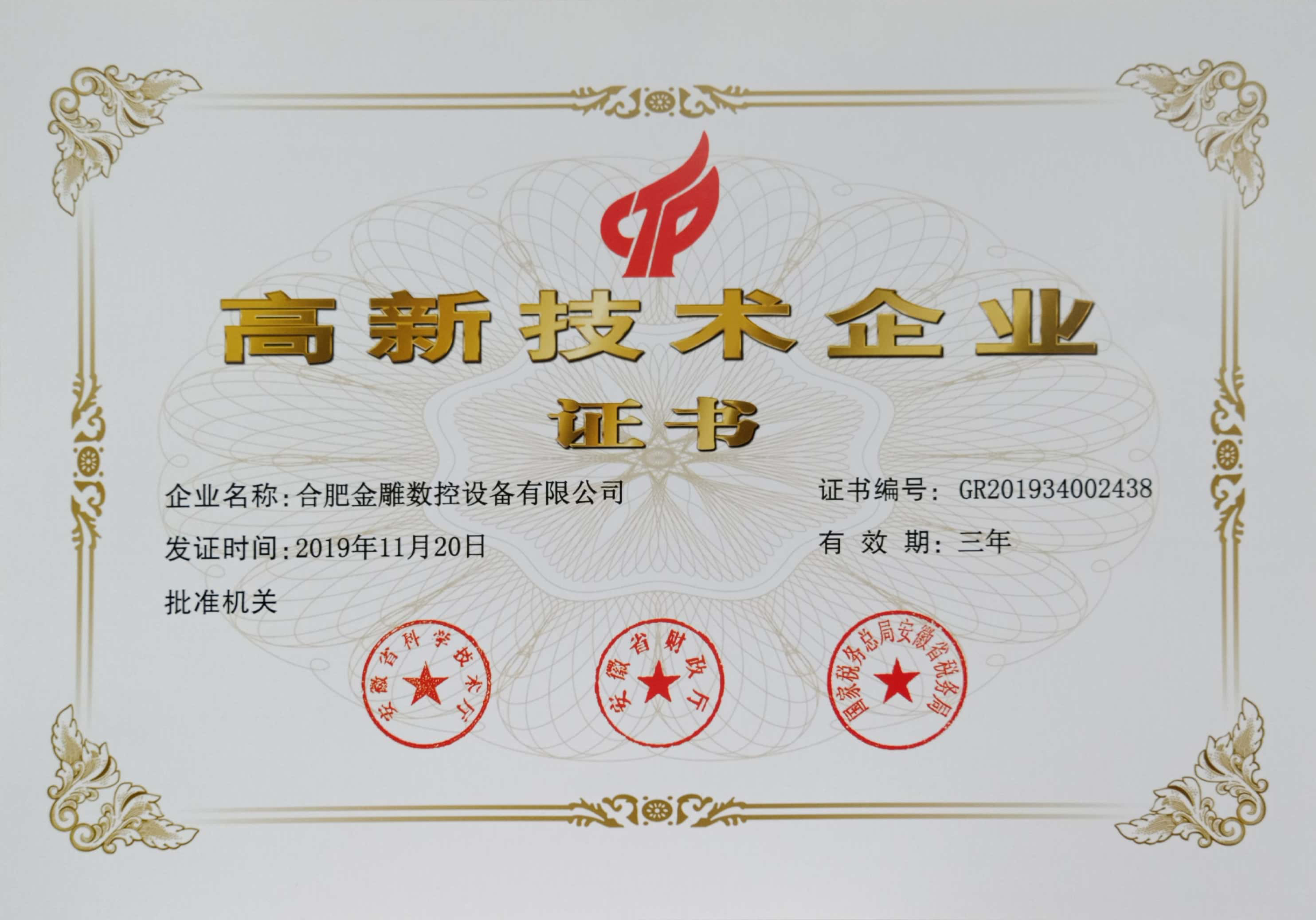 2020新年伊始,合肥金雕逆勢進發(fā),踏上了新的征程,憑借強勁的研發(fā)實力和專業(yè)的生產能力,一直秉承開拓創(chuàng)新的理念,融合科學的企業(yè)管理,再次通過國家級高新技術企業(yè)的審批,于2020年3月3日收到了由安徽省科學技術廳、安徽省財政廳、安徽省國家稅務局聯合頒發(fā)的“高新技術企業(yè)”榮譽證書,由此衛(wèi)冕國家高新技術企業(yè)殊榮。