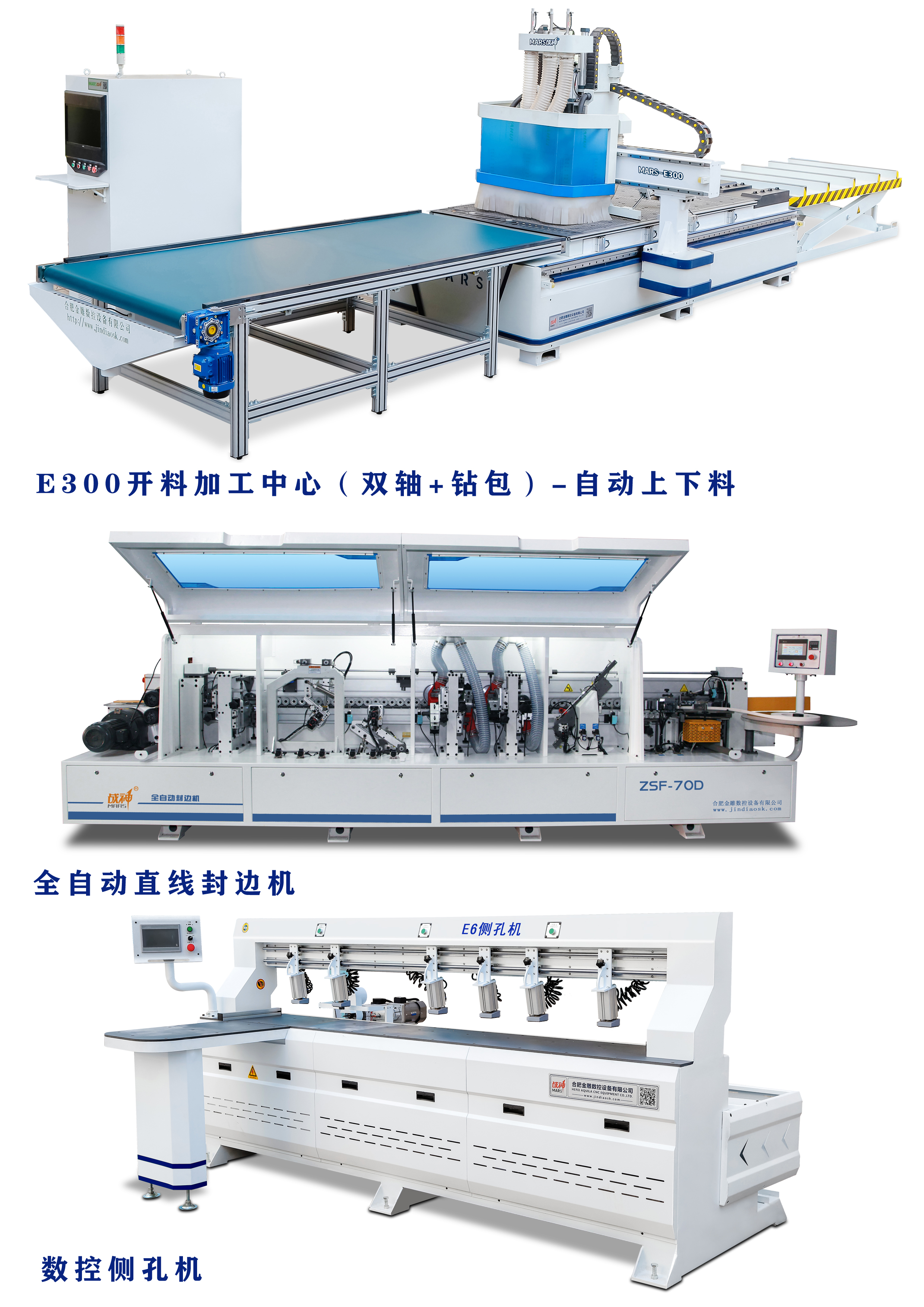 2、數控開料機 (E300智能化板式開料加工中心(雙主軸+鉆包)-自動上下料 功能闡述: 數控化操控,單、雙工位,帶鉆包; 用于板材開料、鉆孔、異形加工。