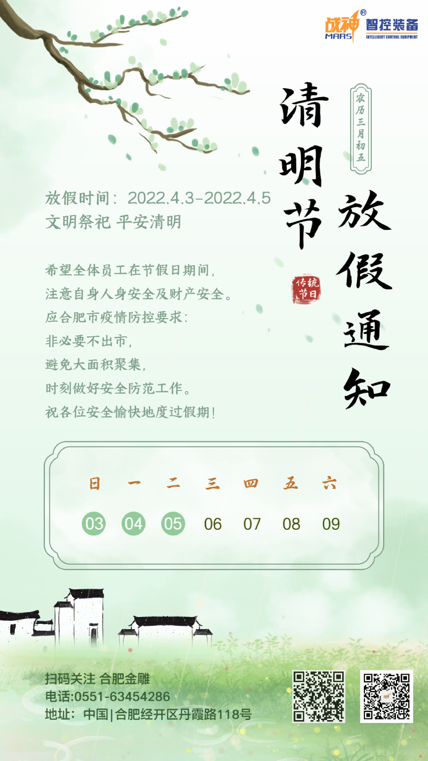 關于2022年合肥金雕數控設備有限公司清明節放假的通知