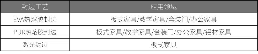 目前,國內市場上主流的封邊工藝分別是:EVA、PUR和激光封邊。其中,EVA熱熔膠產品長期以來一直占據著封邊熱熔膠的主導地位。隨著消費者環保需求的消費覺醒,PUR以其美觀、良好的封邊效果、高性價比和環保性,受到了更多企業的青睞。而激光封邊技術作為近年來新興的一種新型封邊技術逐漸走進家具封邊市場。