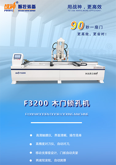 戰神MARS-F3200木門鎖孔機主要加工門扇或門扇拼裝前的鎖槽孔,門頁槽等,一次性完成木門鎖孔,鎖槽,合頁槽的加工;適用于各大門類廠家,實木家具,全屋定制廠家。