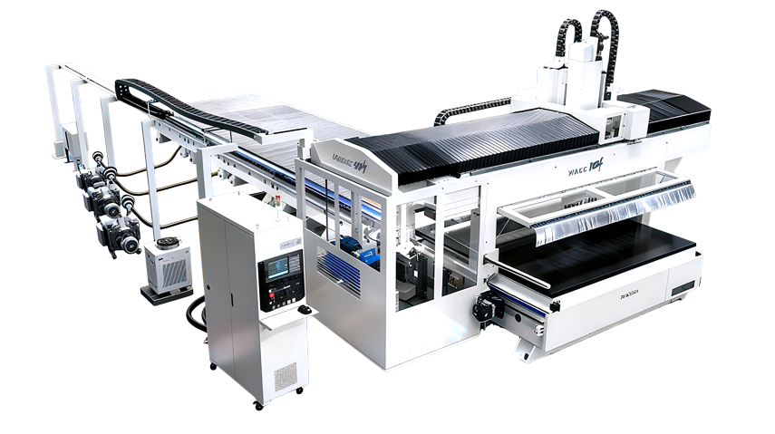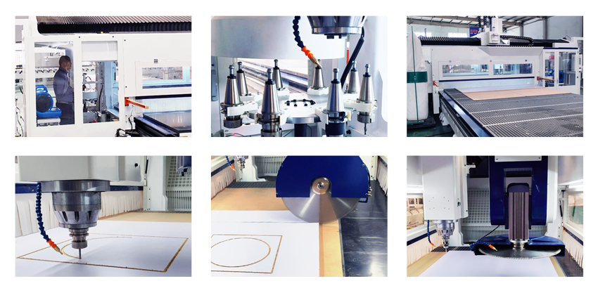 五軸鋸銑復(fù)合加工, 大幅提升加工效率 可完成切割、打孔、 銑削等多種工序在內(nèi)的一體化加工 用于各類車廂載體內(nèi)外結(jié)構(gòu)的板材加工